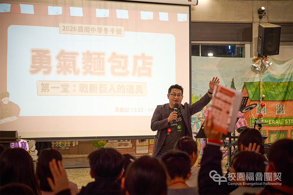 2026 嘉南高屏中學冬令營於一月 27-30 日在長榮大學舉辦,超過 52 位的夥伴願意義務來擔任小組輔導、體驗引導員以及義工,一同度過四天三夜的「 勇氣麵包店 」!本次營會以麵包店與麵包種類為主題包裝,期盼透過體驗引導員的帶領以及小組輔導的陪伴,使學員在體驗活動中真實體察自我感受,進而更多認識自己、反思與上帝的關係,並藉由晚堂信息更深刻認識上帝。